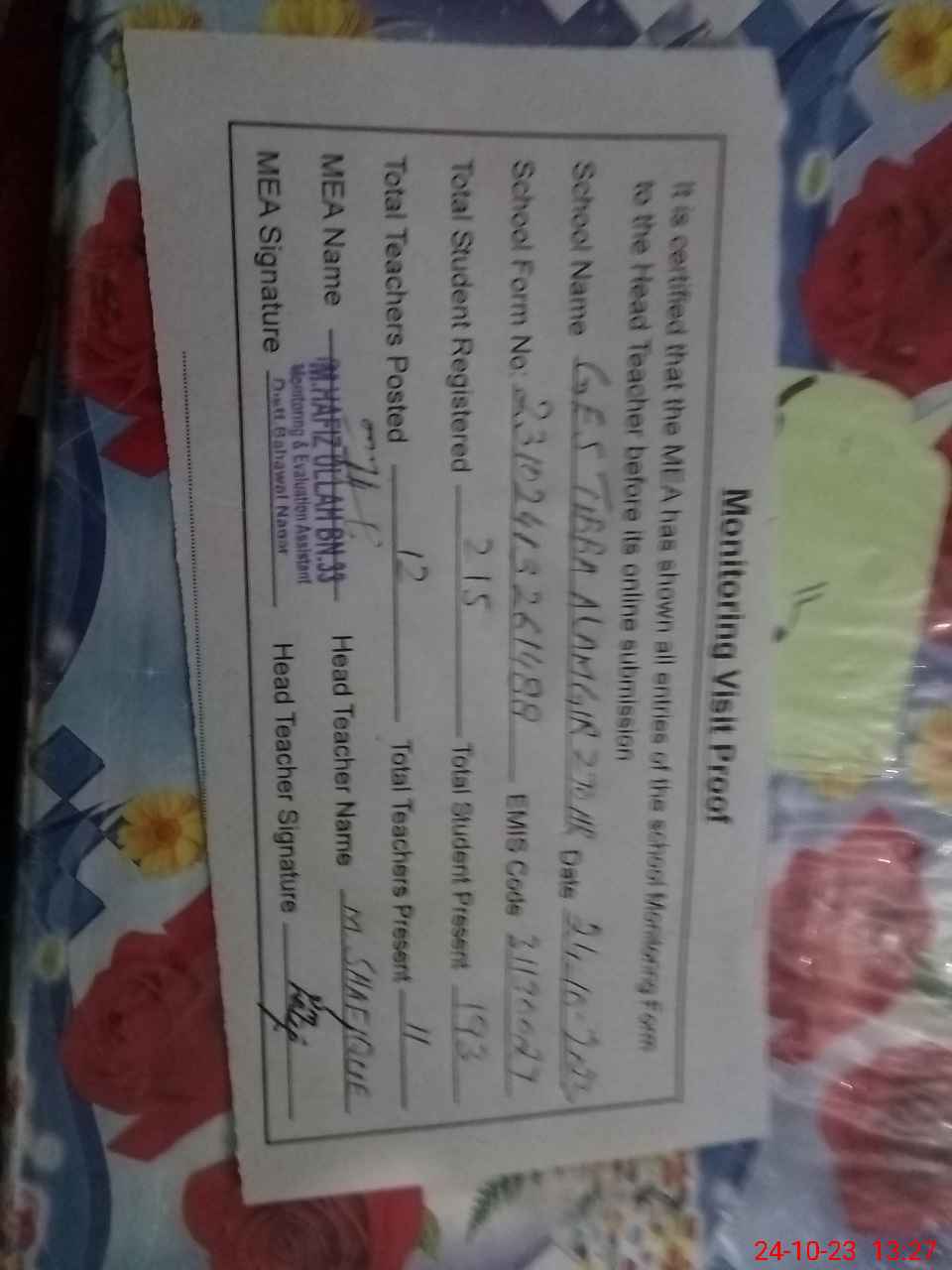 | Attendance Register | Head Teacher | MEA with School | Visit Proof |