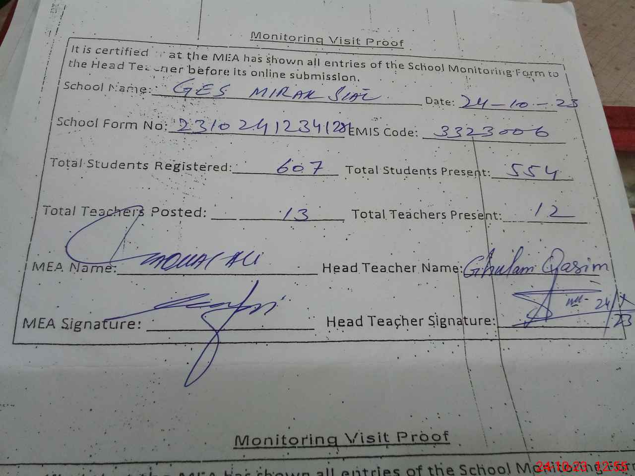 | Attendance Register | Head Teacher | MEA with School | Visit Proof |