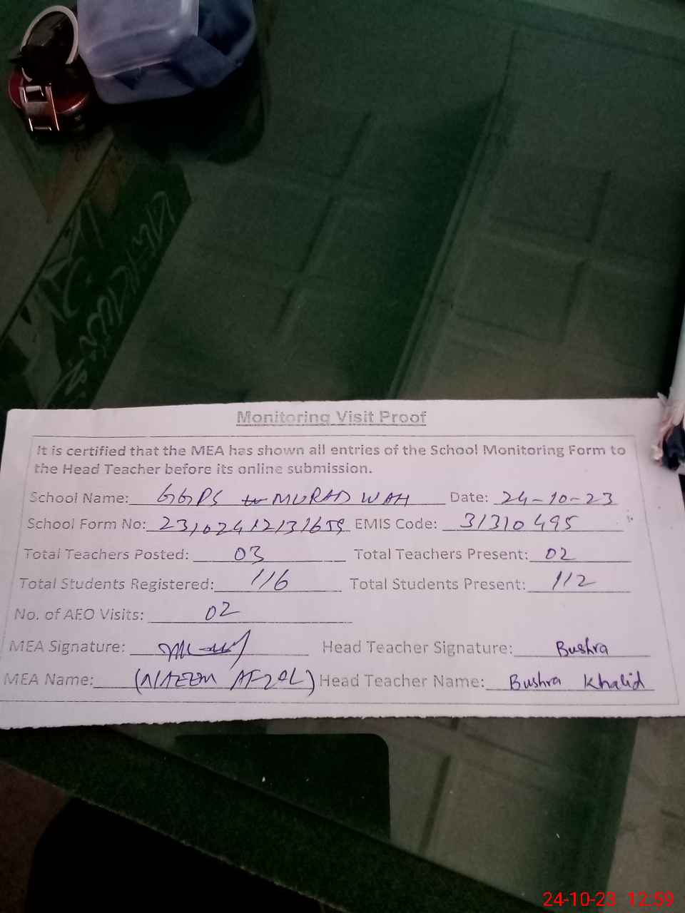 | Attendance Register | Head Teacher | MEA with School | Visit Proof |