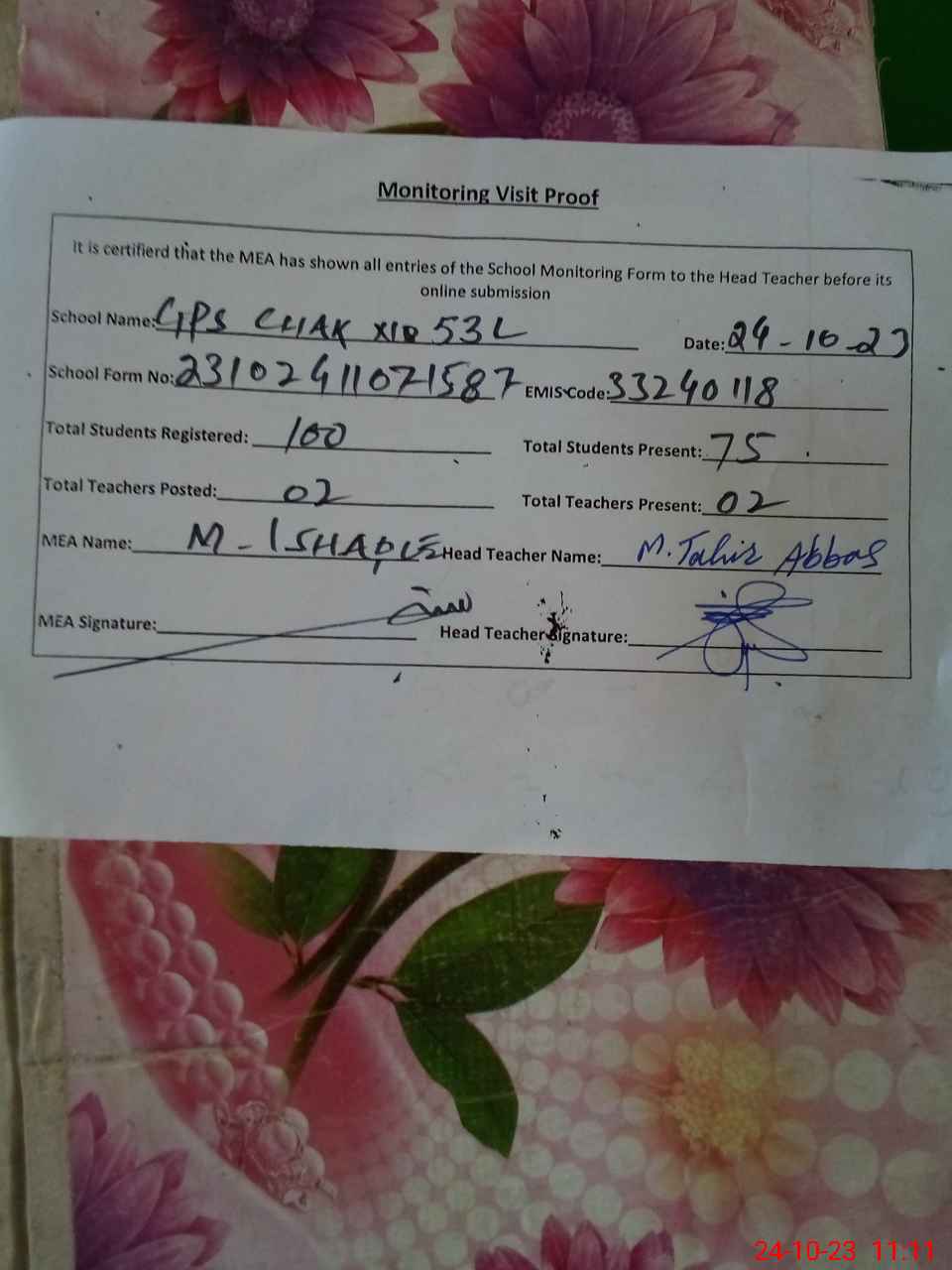 | Certified that this School was Inspected by the Undersigned MEA/DMO Today and the Information Stated Above is as Per Record. | |||||