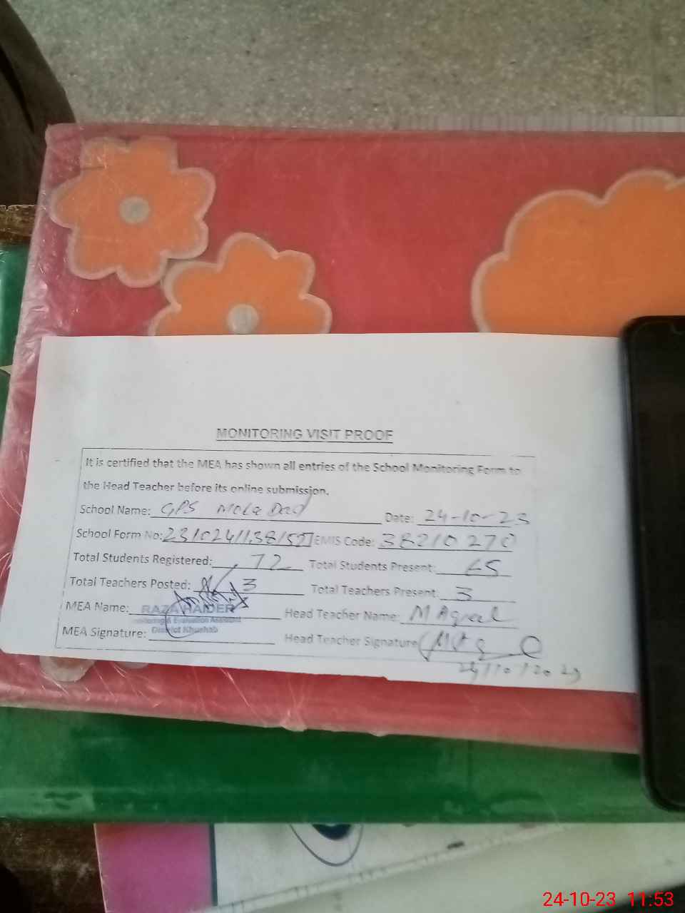 | Attendance Register | Head Teacher | MEA with School | Visit Proof |