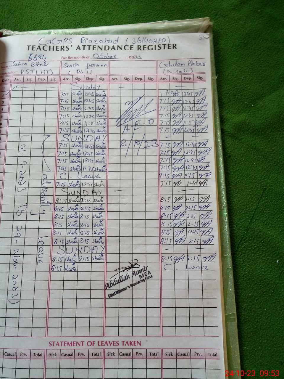 | 36**** | Sa**** Bi**** | 1 | 0 | 0 | 30 | 0 | 0 | 0 | 0 | 0 | 0 | Absent (Un-Authorized) | |