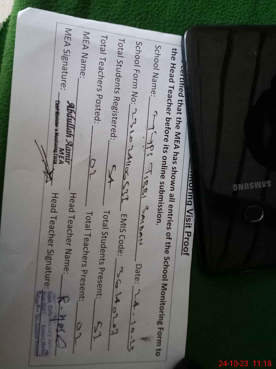 | Attendance Register | Head Teacher | MEA with School | Visit Proof |
