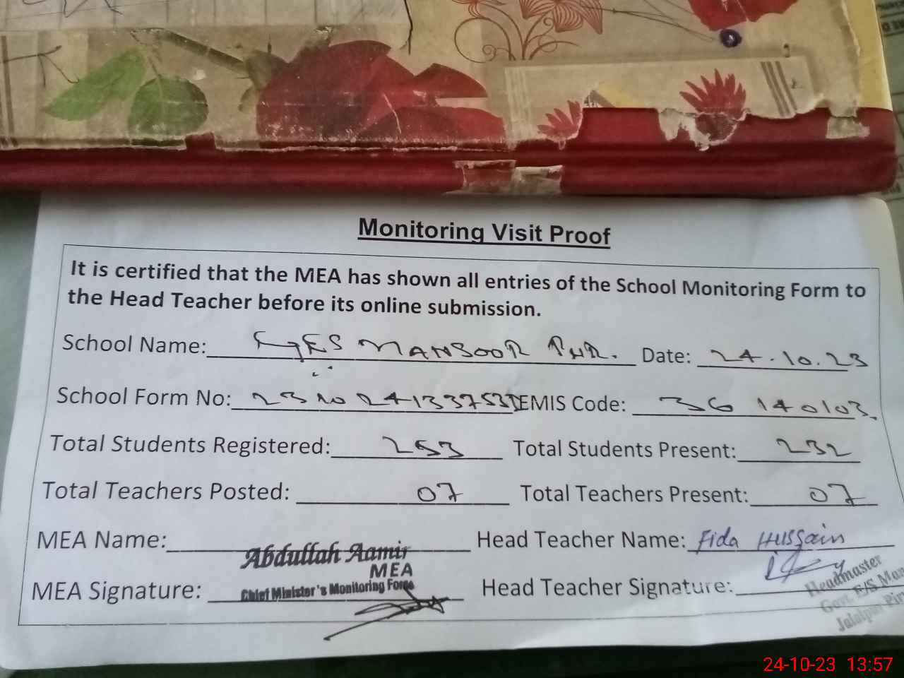 | Attendance Register | Head Teacher | MEA with School | Visit Proof |
