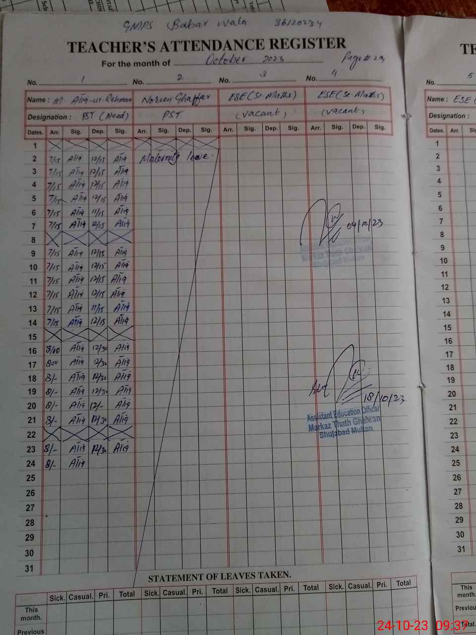 | EMIS Code: 36120234 | Name of School: GMPS BABAR WALA (KALO WALA) | |||