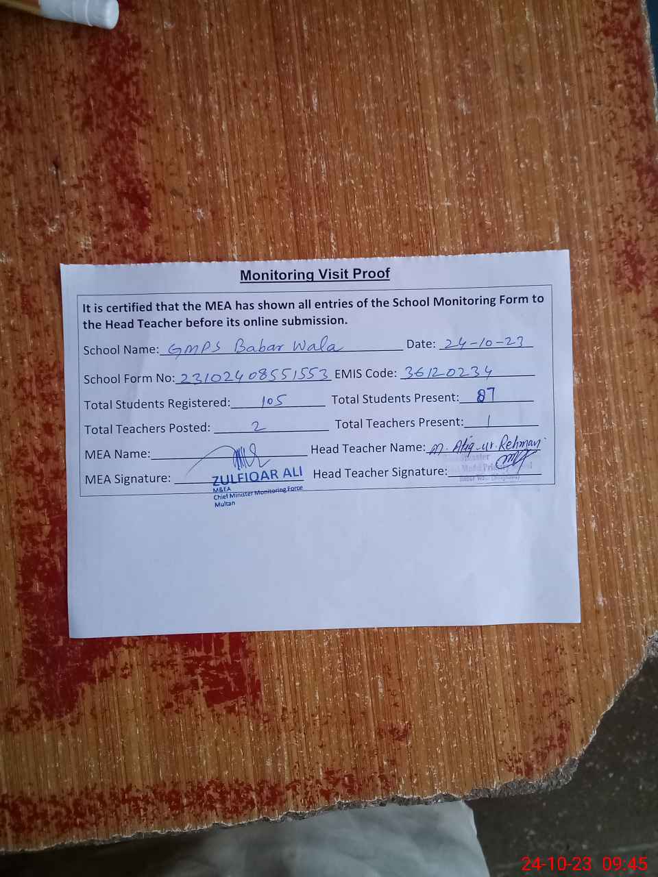 | Attendance Register | Head Teacher | MEA with School | Visit Proof |
