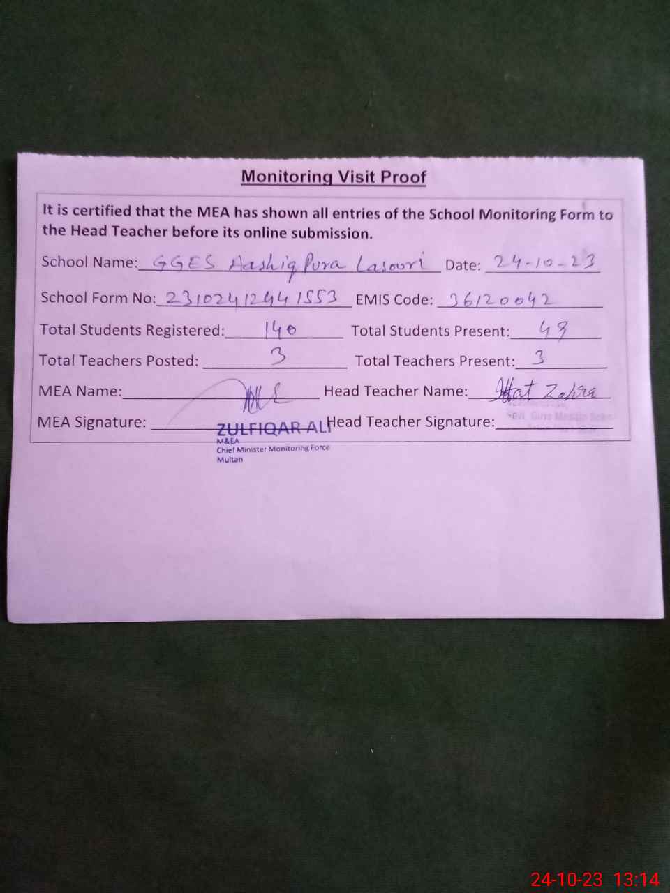 | Attendance Register | Head Teacher | MEA with School | Visit Proof |