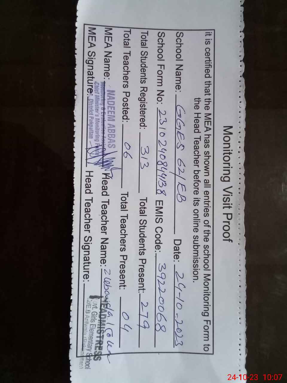 | Certified that this School was Inspected by the Undersigned MEA/DMO Today and the Information Stated Above is as Per Record. | |||||