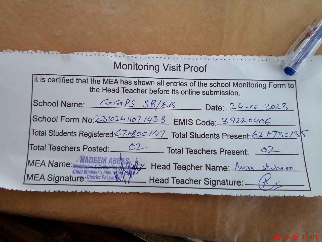 | Attendance Register | Head Teacher | MEA with School | Visit Proof |