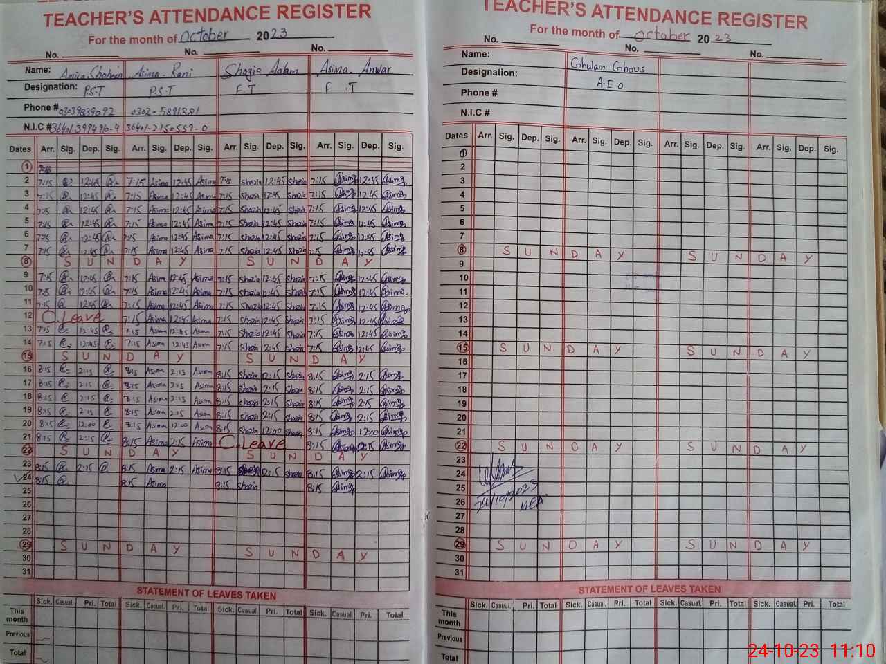 | CNIC | Full Name | Designation | R/C | Absence During Last Calender Month |