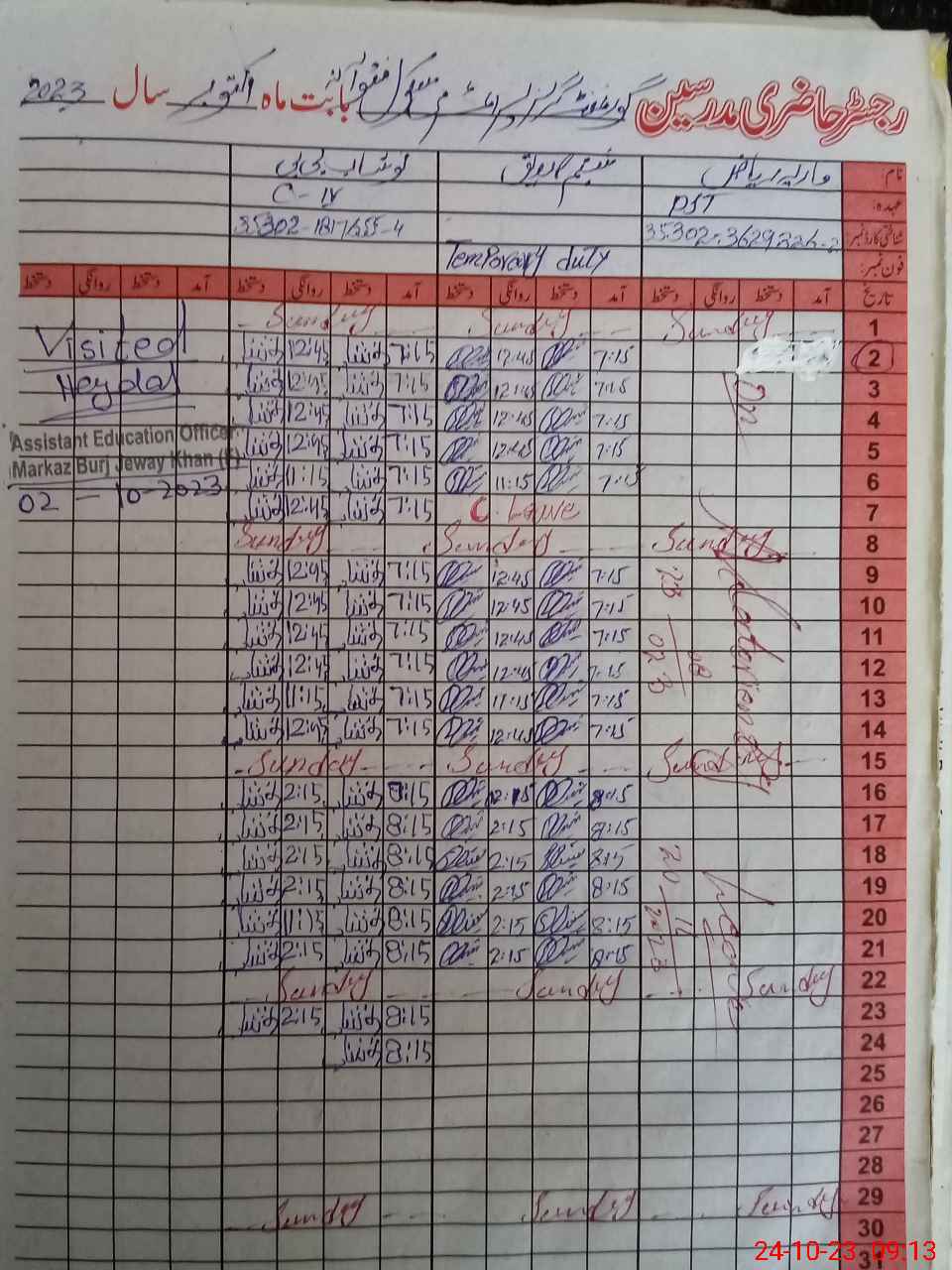 | Remarks (Use Separate Page if Required): private Teacher Mrs Aqsa ishaq cnic 3530212083666 is available in school and permanent teacher mrs Maria riaz is on maternity leave since 23 August 2023 Miss shabnam Siddique Pst GGPS Ghulam kay teh depalpur is directed to perform temporary duty up to 20 November 2023 but she is on duty since 21 October 2023 Now she Is absent | |||||