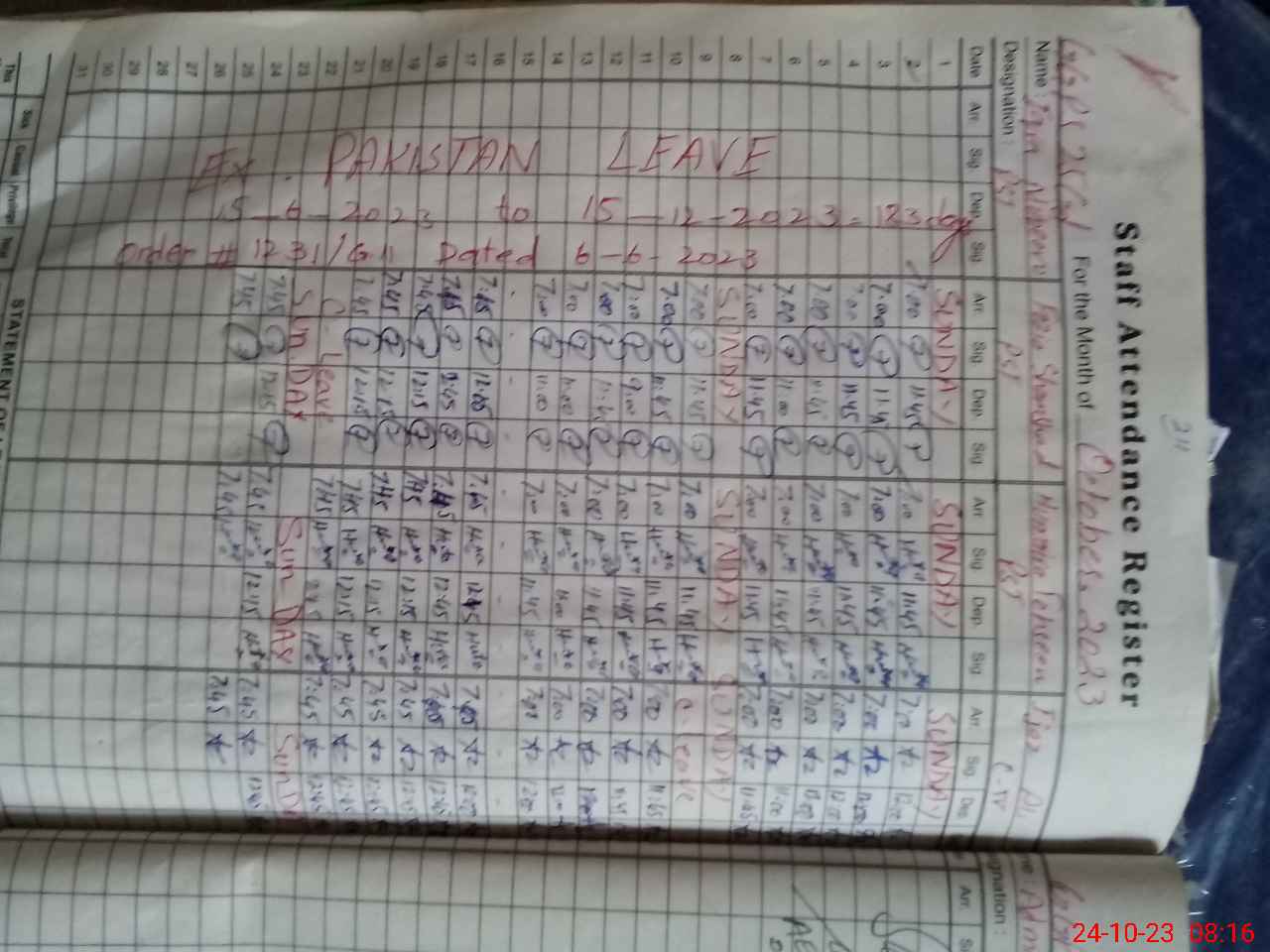 | Leave | Duty | Absent | Maternity | Medical | Ex- Pak |