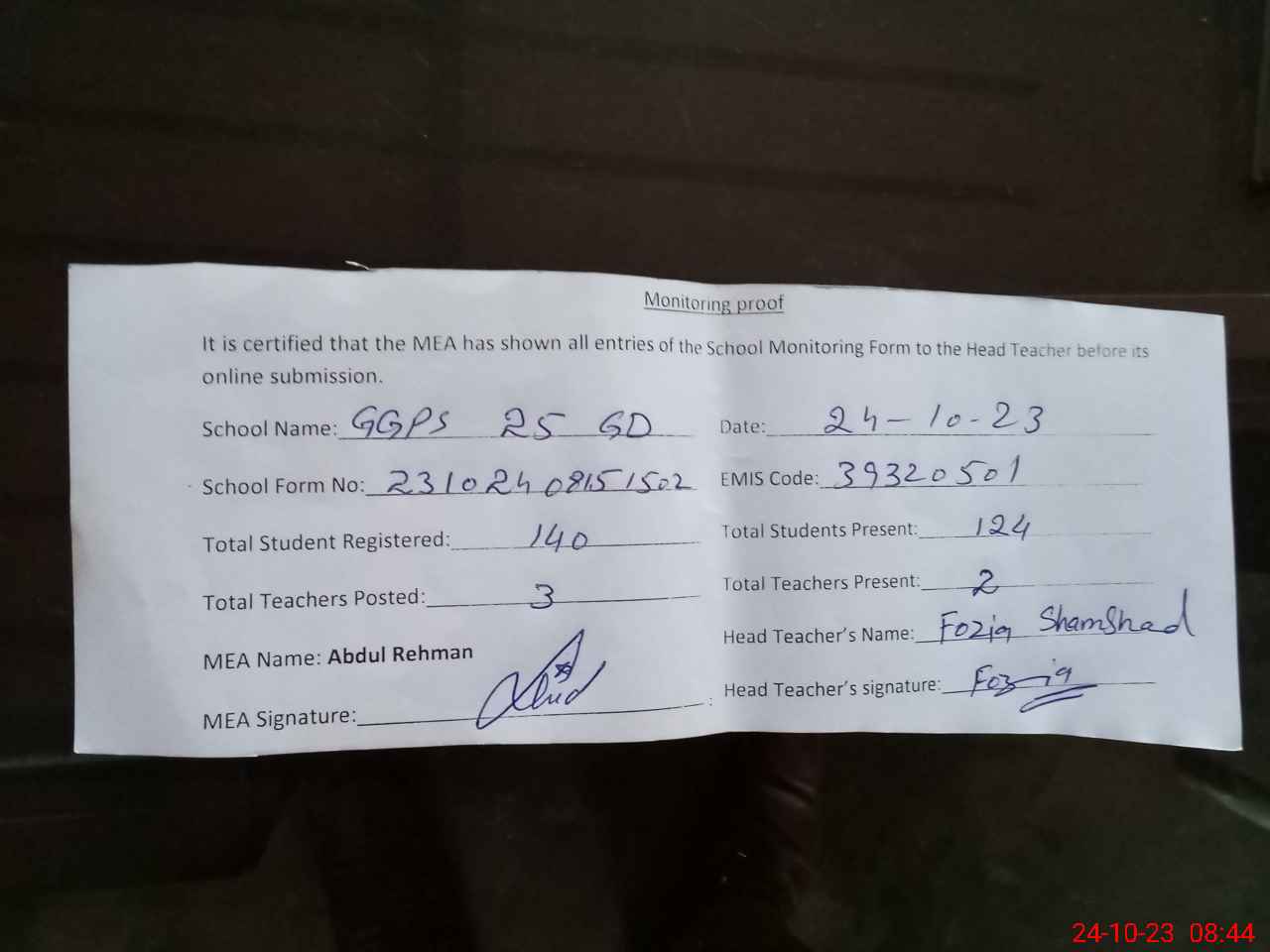 | Attendance Register | Head Teacher | MEA with School | Visit Proof |