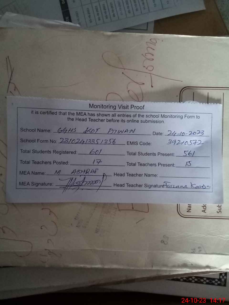 | Attendance Register | Head Teacher | MEA with School | Visit Proof |