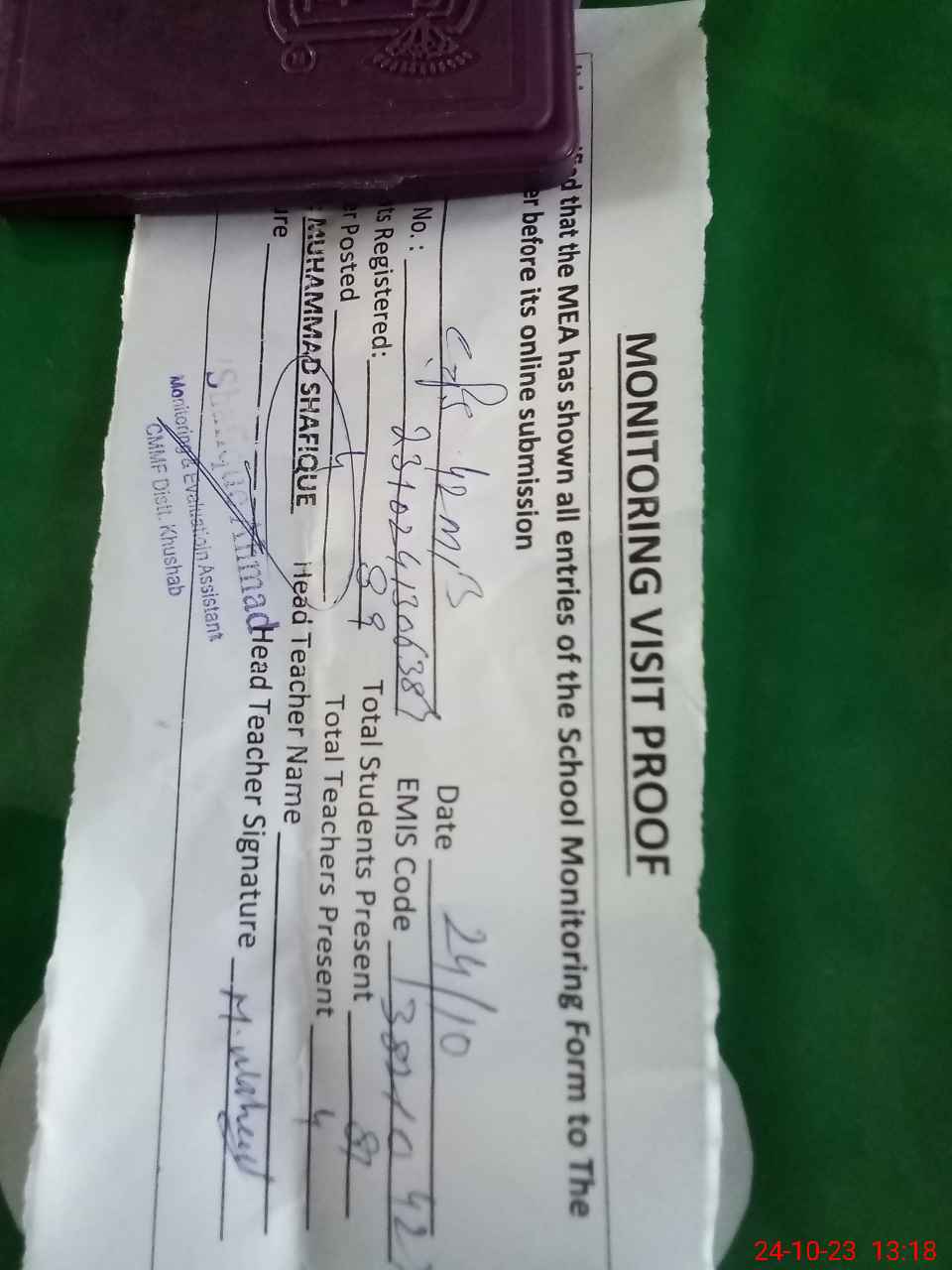 | Attendance Register | Head Teacher | MEA with School | Visit Proof |