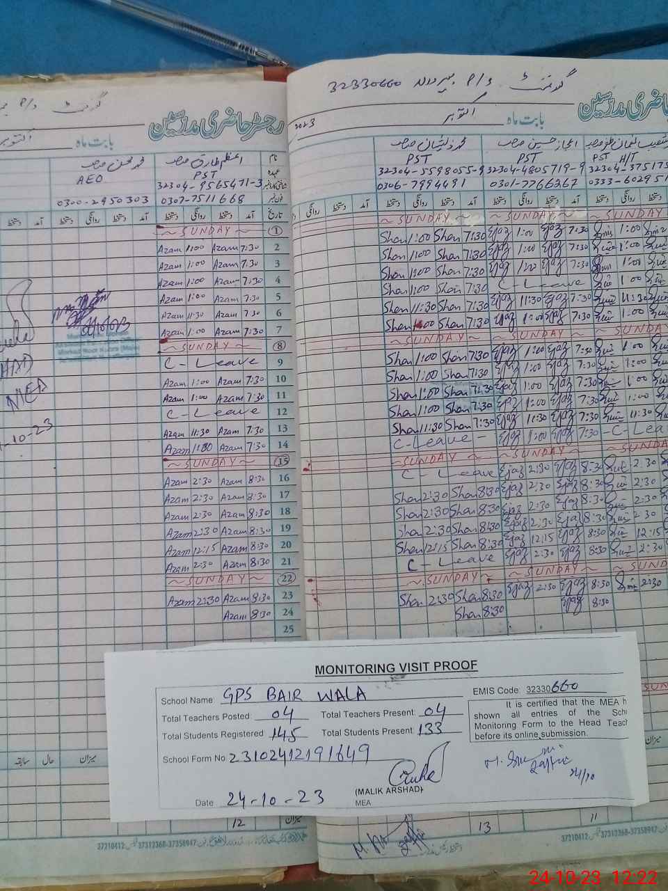 | Attendance Register | Head Teacher | MEA with School | Visit Proof |