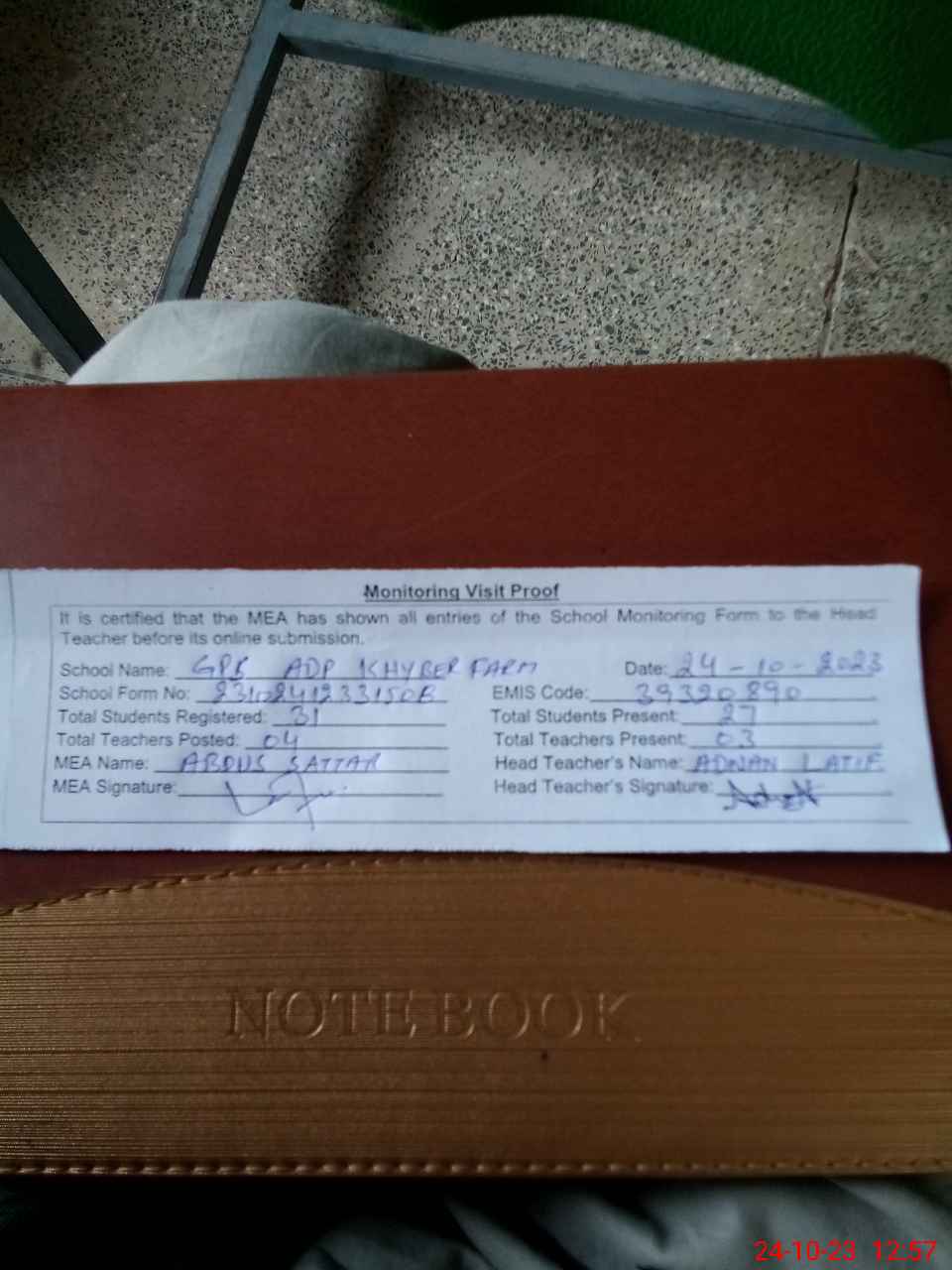 | Attendance Register | Head Teacher | MEA with School | Visit Proof |