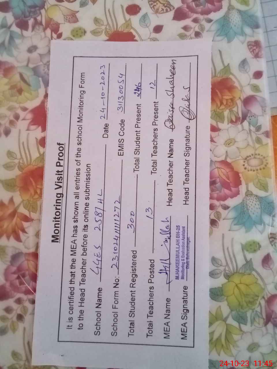 | Attendance Register | Head Teacher | MEA with School | Visit Proof |