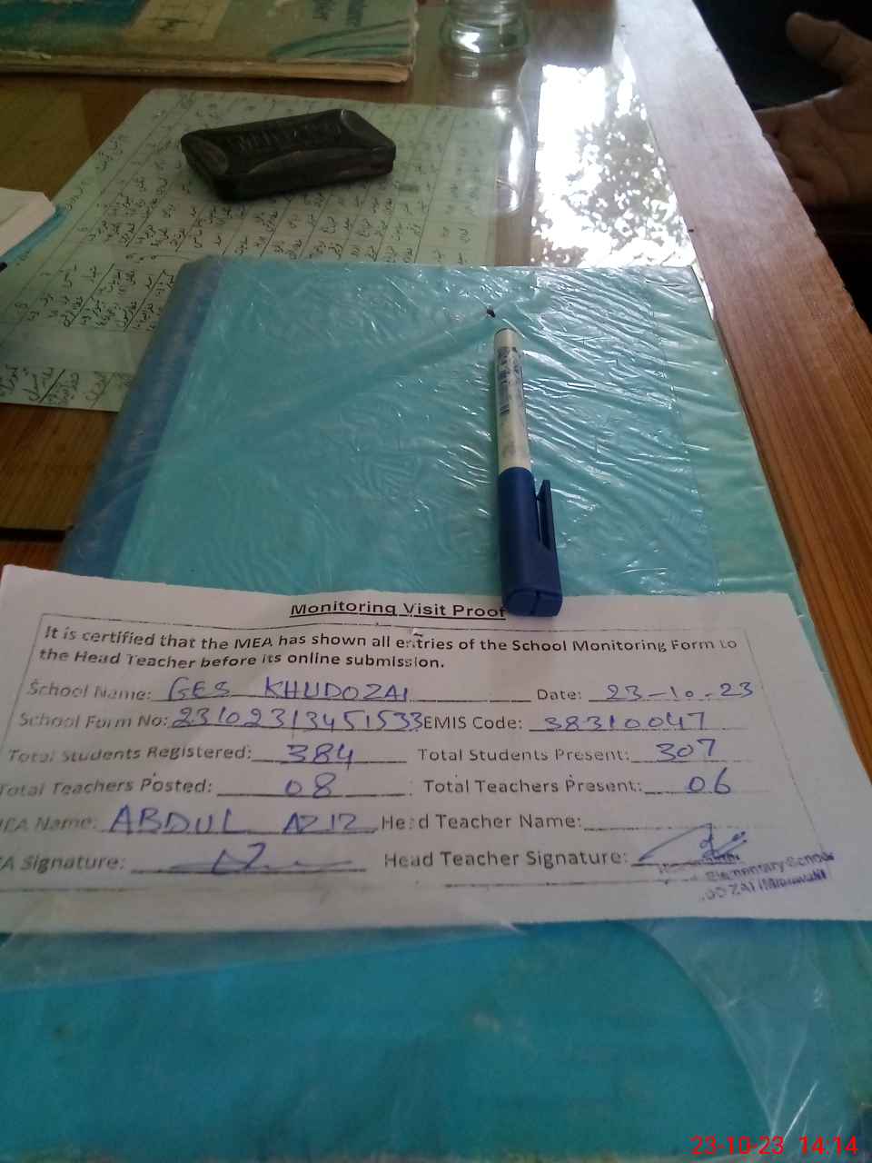 | Attendance Register | Head Teacher | MEA with School | Visit Proof |