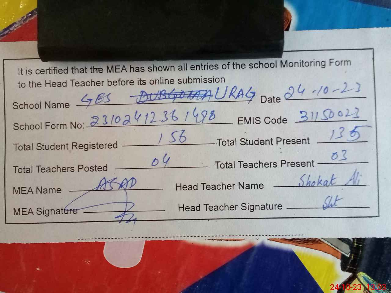 | Attendance Register | Head Teacher | MEA with School | Visit Proof |