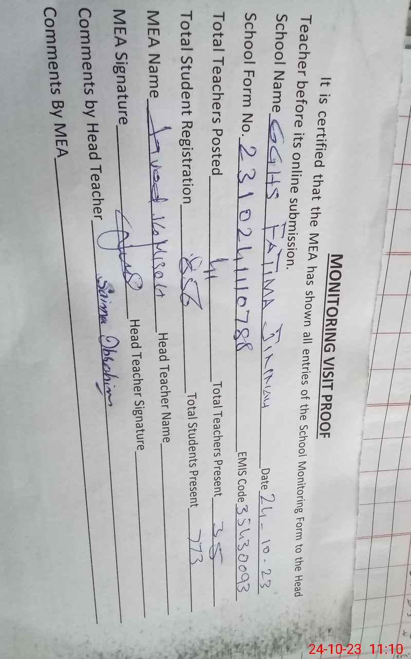 | EMIS Code: 35430093 | Name of School: GGHS FATIMA JINNAH SHEIKHUPURA | |||