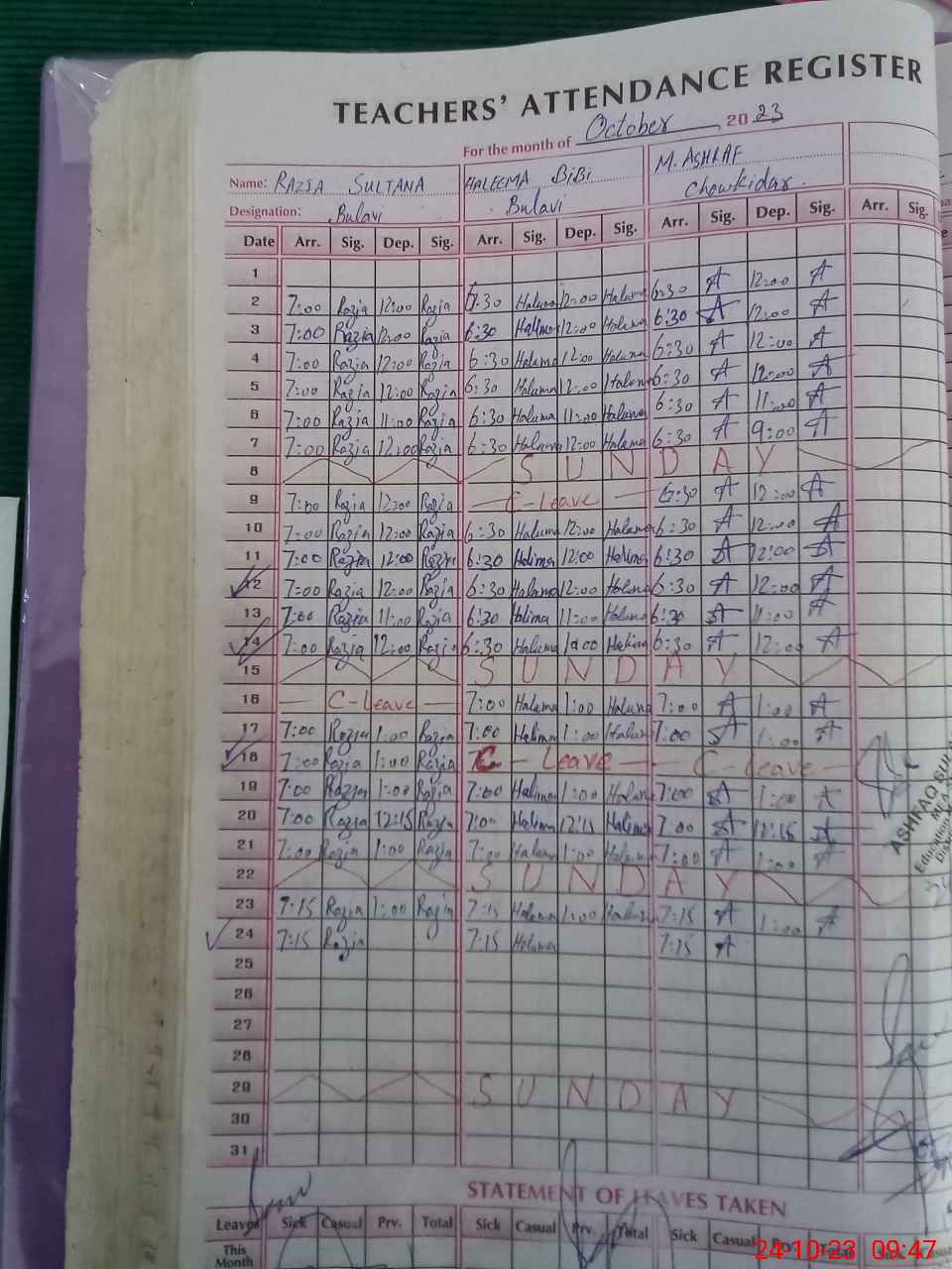 | CNIC | Full Name | Designation | R/C | Absence During Last Calender Month |