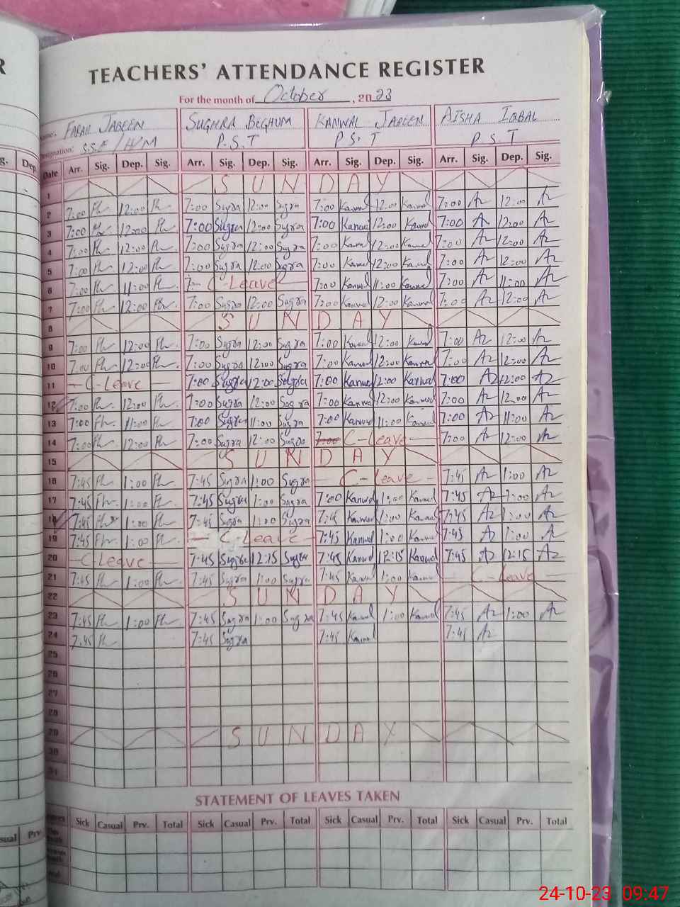 | Leave | Duty | Absent | Maternity | Medical | Ex- Pak |