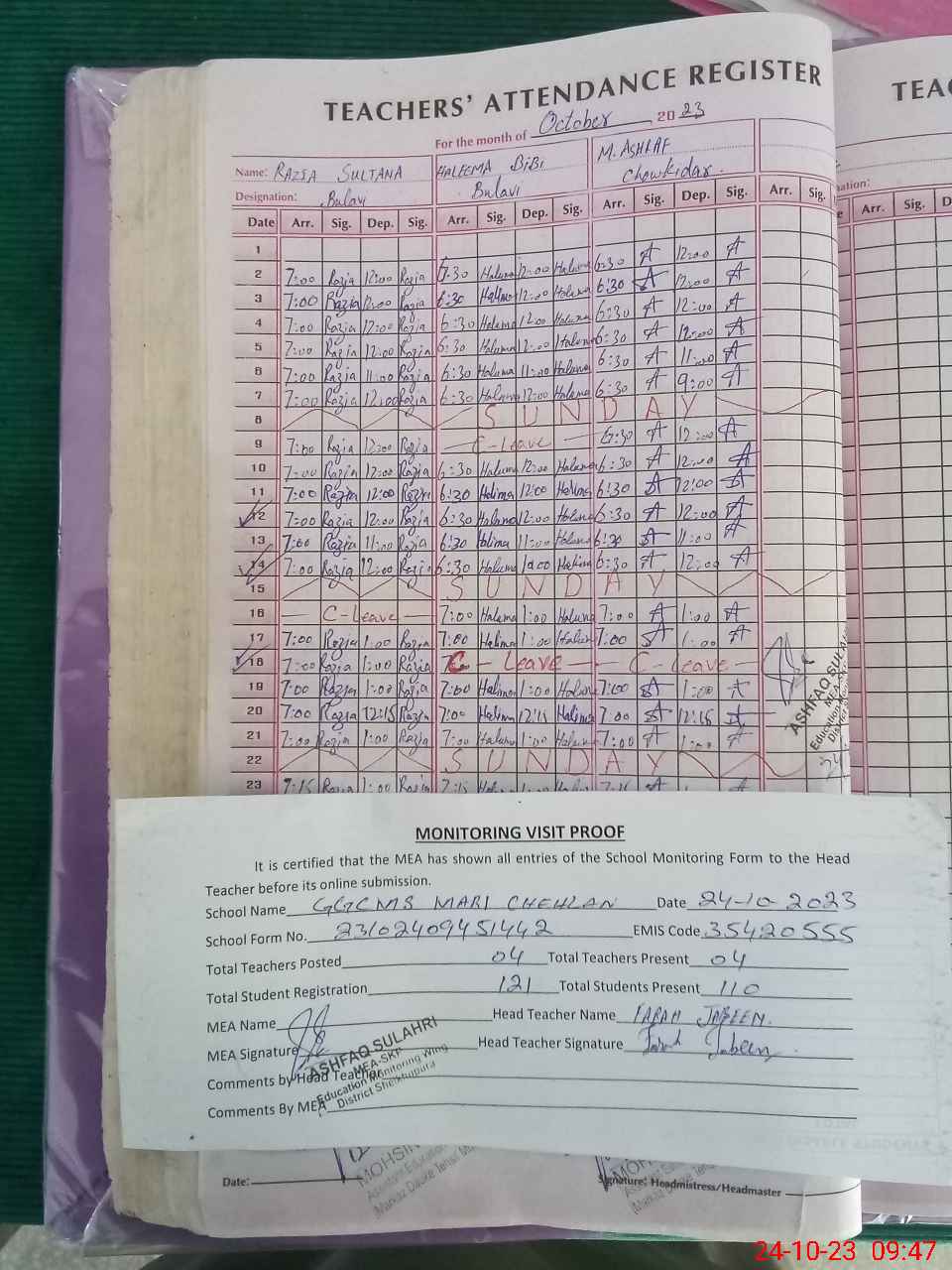 | Attendance Register | Head Teacher | MEA with School | Visit Proof |