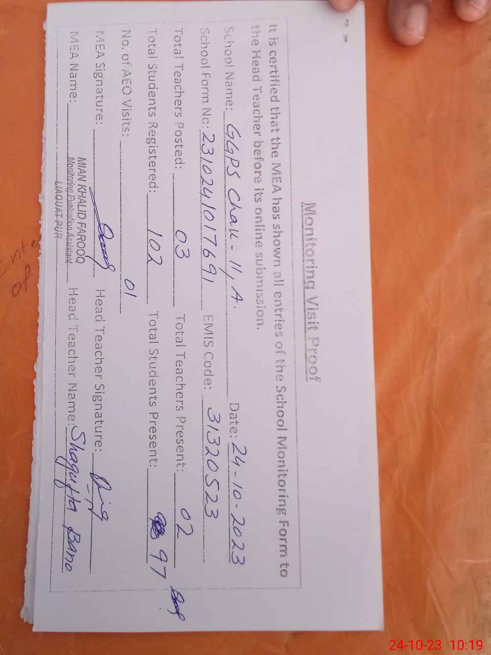 | Attendance Register | Head Teacher | MEA with School | Visit Proof |