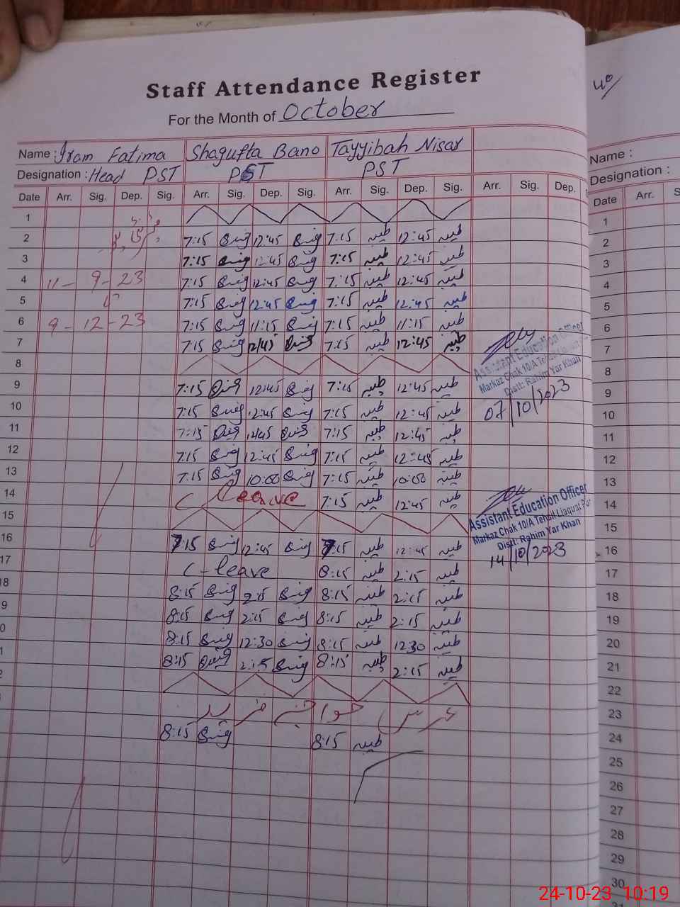| Name: IR**** FA**** Designation: (School Headmaster's/Headmistress's) PST Phone/Cell Number: 03**** |