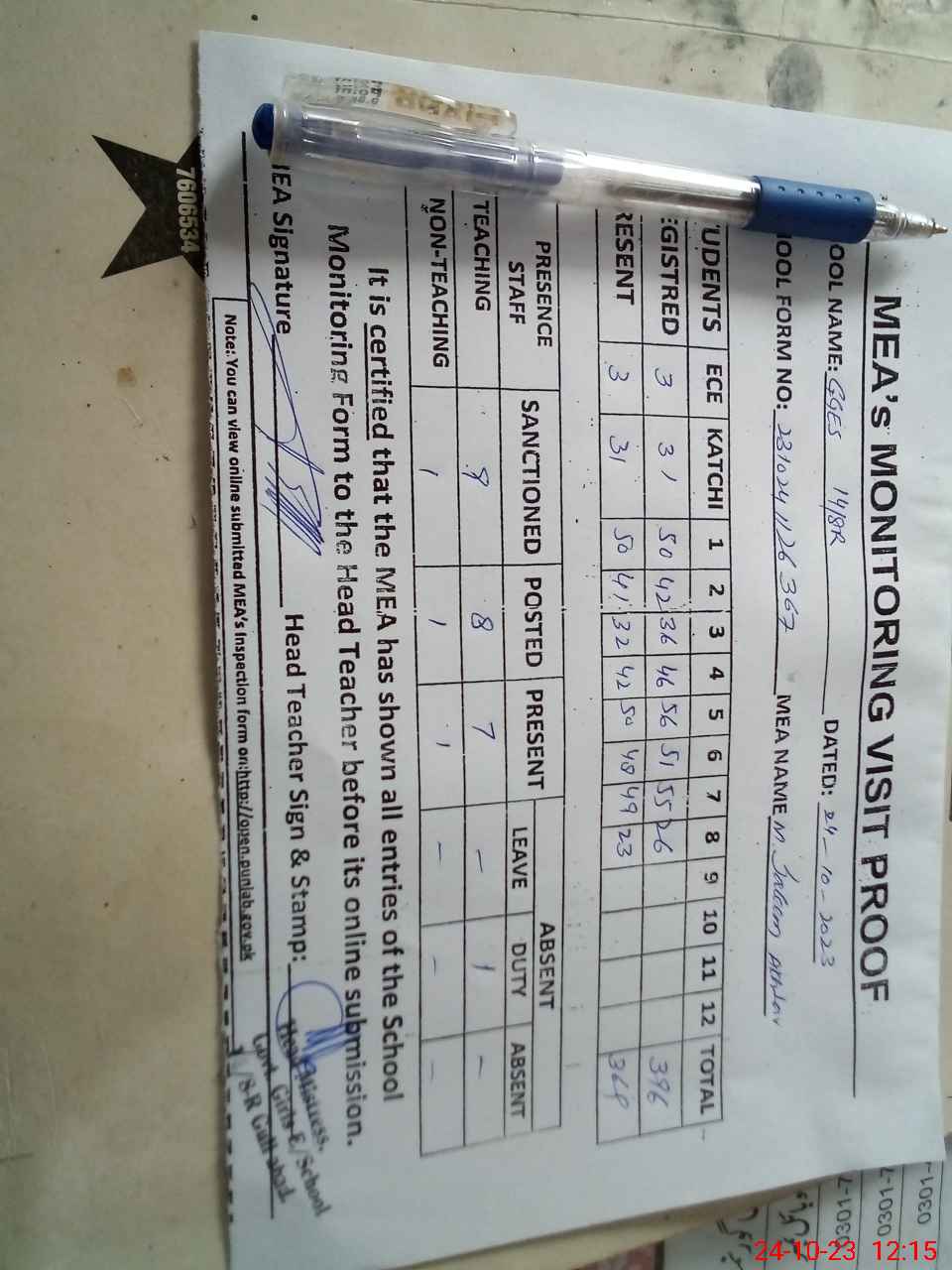 | Attendance Register | Head Teacher | MEA with School | Visit Proof |