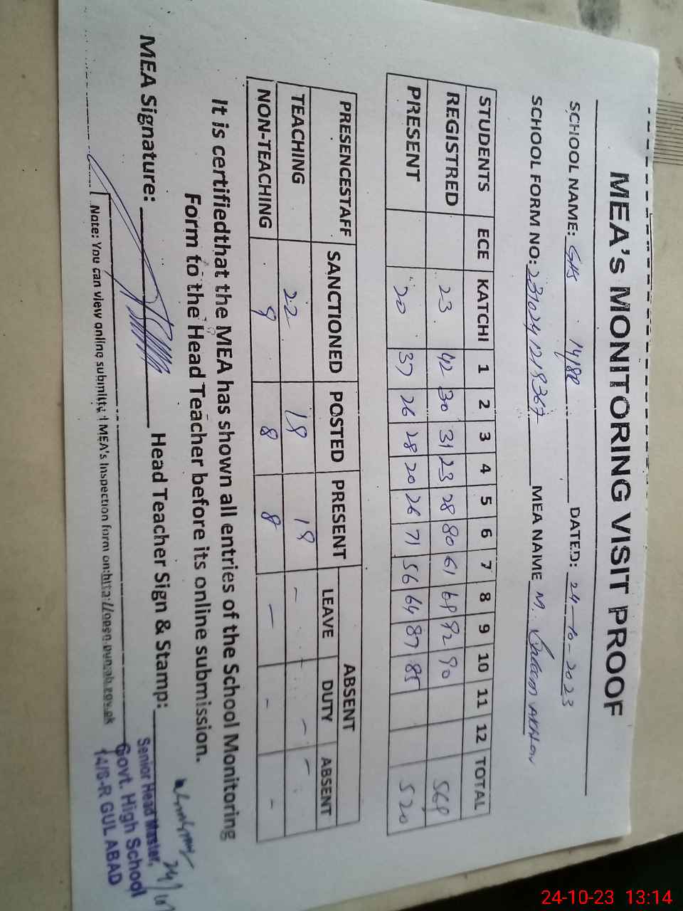 | Attendance Register | Head Teacher | MEA with School | Visit Proof |