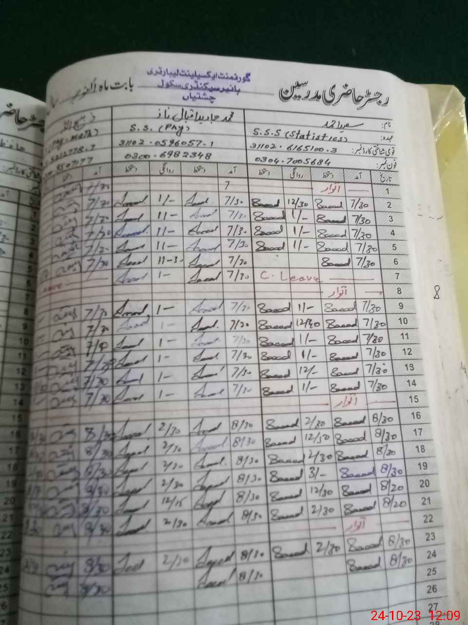 | Name: Sa**** ah**** Designation: (School Headmaster's/Headmistress's) Principal Phone/Cell Number: 03**** |