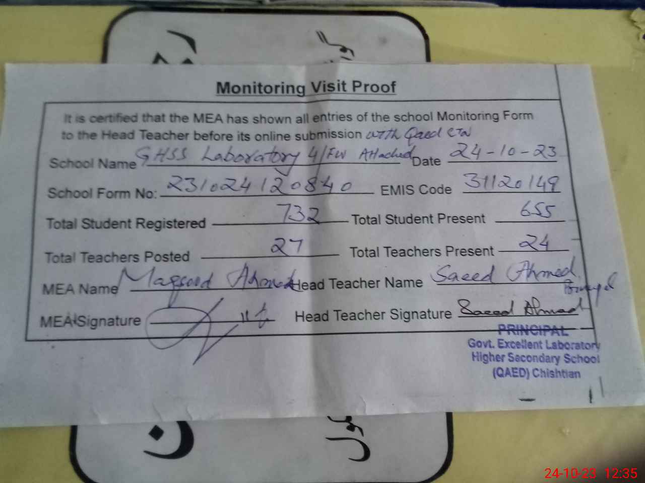 | EMIS Code: 31120149 | Name of School: GHSS LABORATORY 4/FW (ATTACH WITH QAED) CHISHTIAN | |||