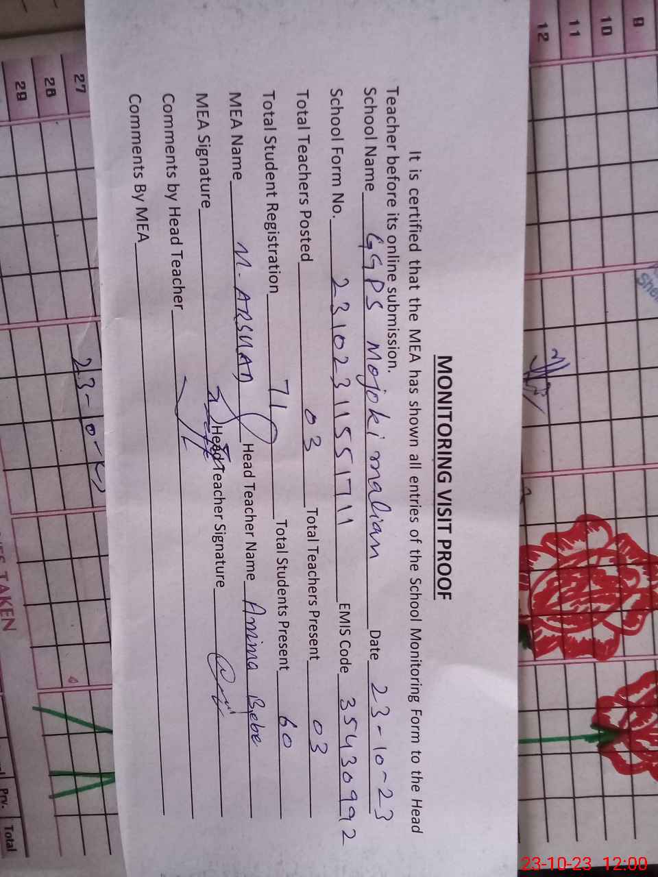 | Attendance Register | Head Teacher | MEA with School | Visit Proof |