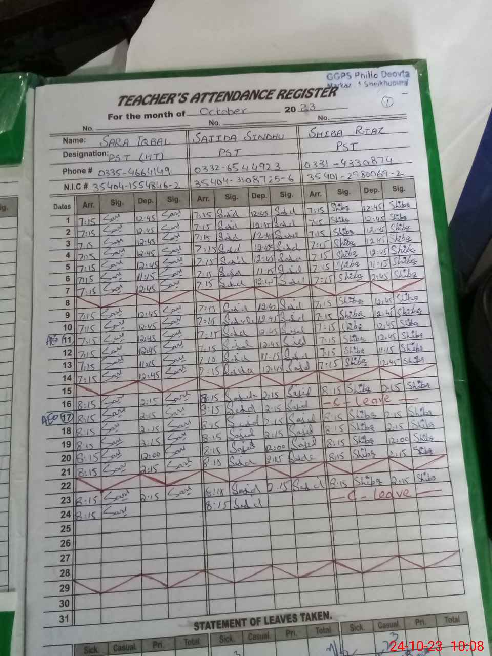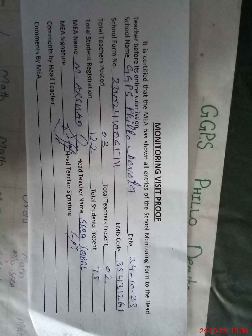 | Name: SA**** IQ**** Designation: (School Headmaster's/Headmistress's) PST Phone/Cell Number: 03**** |