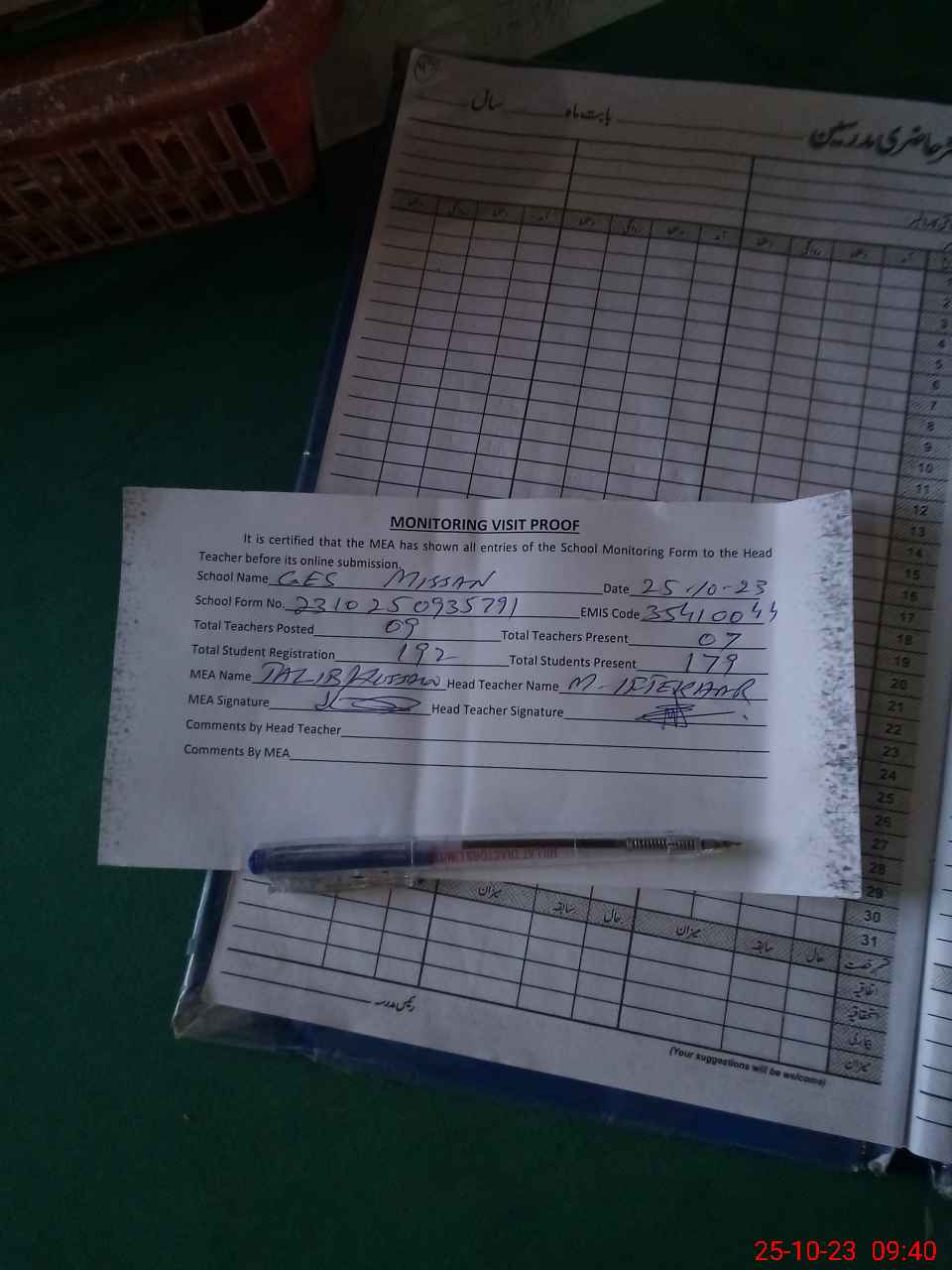 | Attendance Register | Head Teacher | MEA with School | Visit Proof |