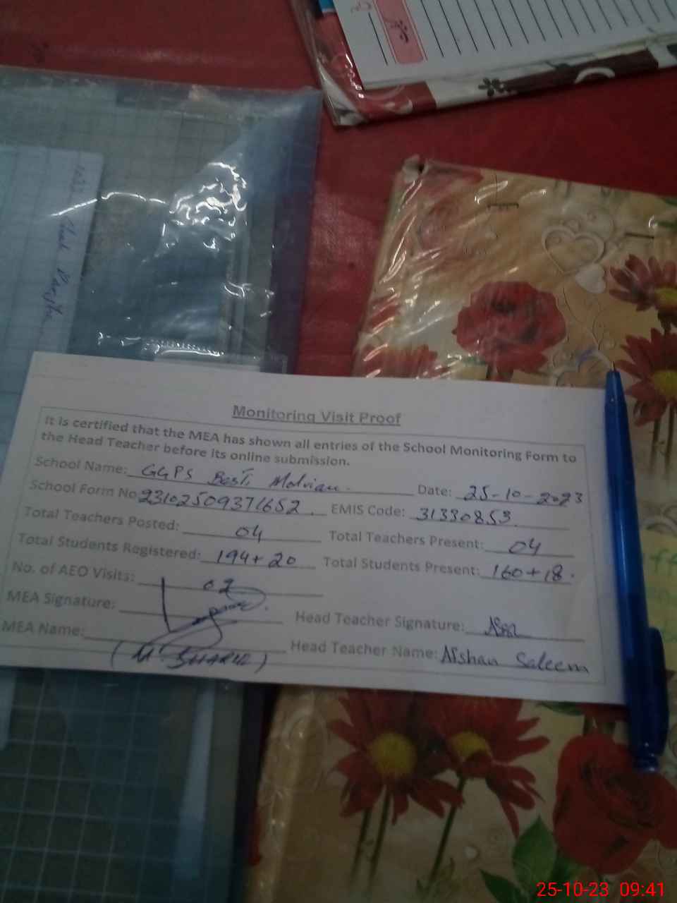 | Attendance Register | Head Teacher | MEA with School | Visit Proof |