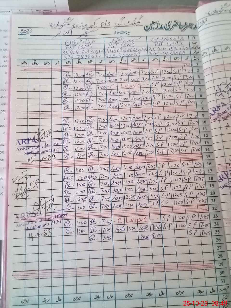 | Name: Sh**** Pa**** Designation: (School Headmaster's/Headmistress's) PST Phone/Cell Number: 03**** |