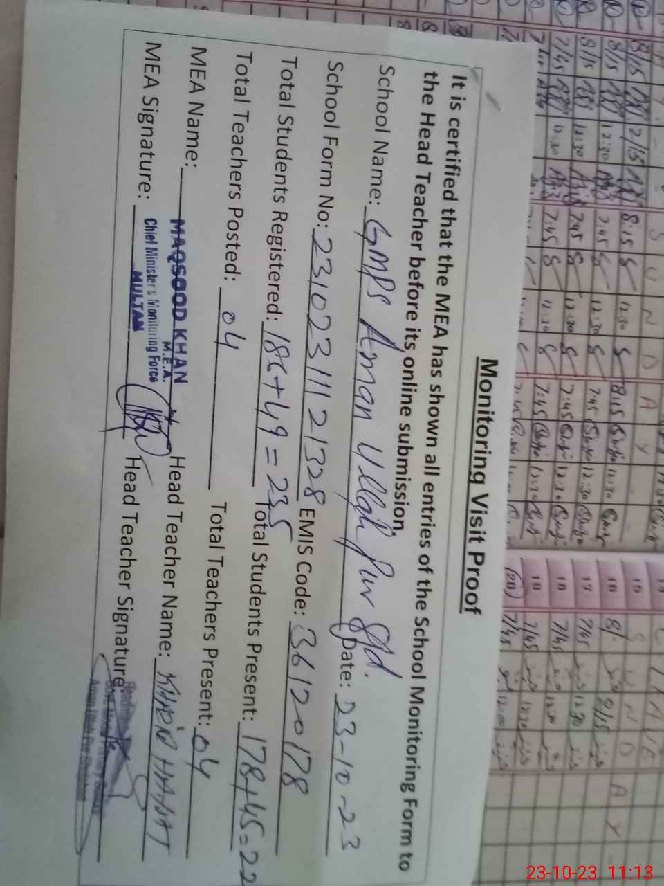 | Certified that this School was Inspected by the Undersigned MEA/DMO Today and the Information Stated Above is as Per Record. | |||||