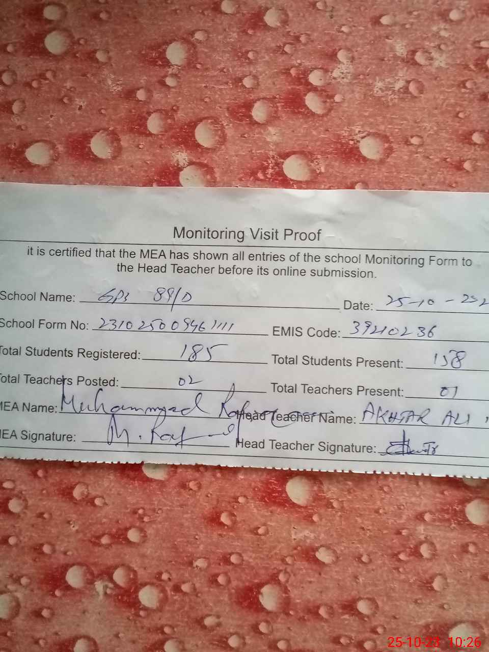 | Certified that this School was Inspected by the Undersigned MEA/DMO Today and the Information Stated Above is as Per Record. | |||||