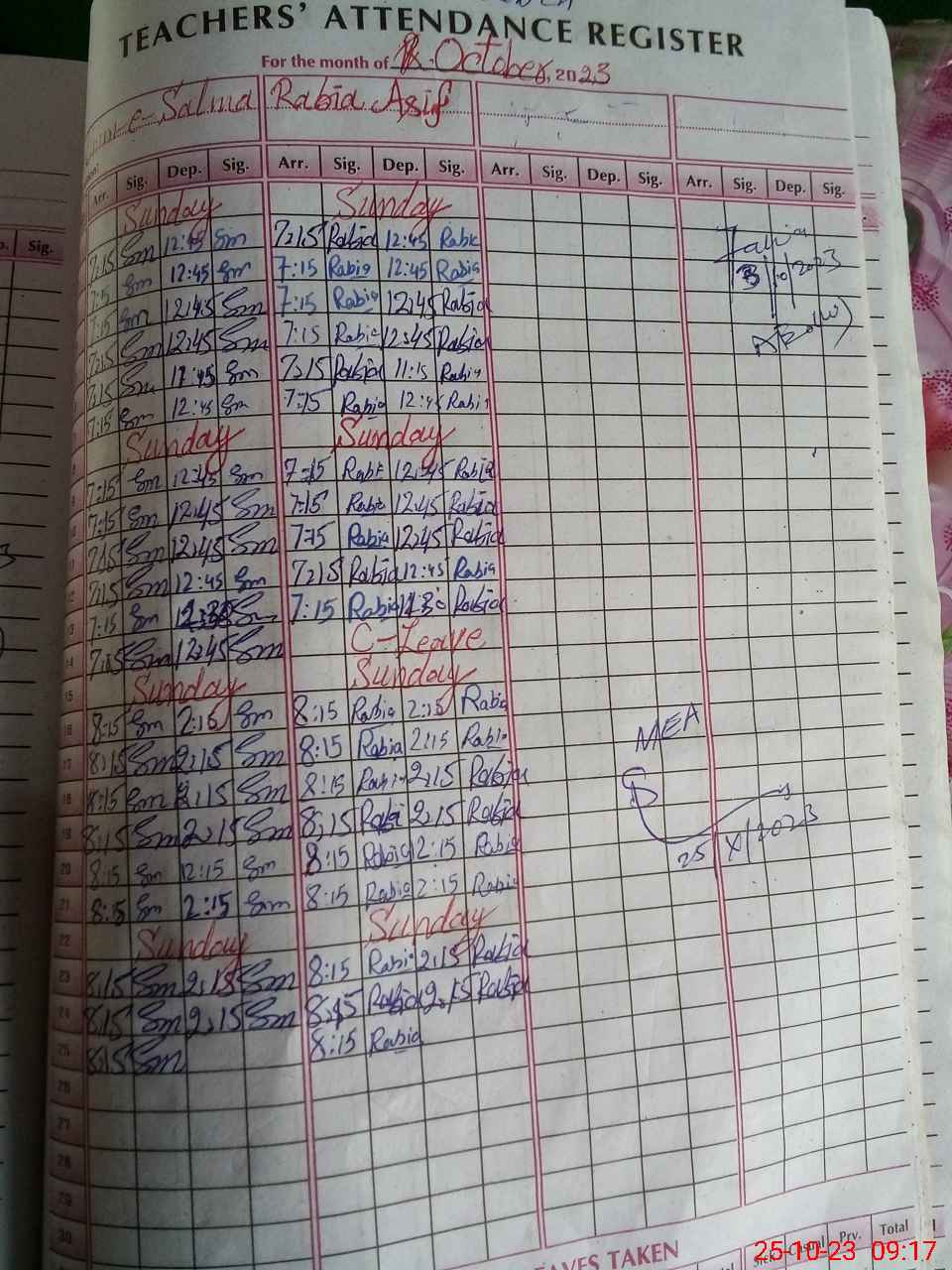 | Monitoring Date: 25-10-2023 | Start Time: 25-10-2023 08:46 AM | End Time: 25-10-2023 09:51 AM | Name of MEA: Sa**** Ah**** | |