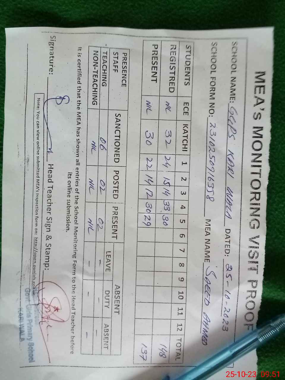 | Attendance Register | Head Teacher | MEA with School | Visit Proof |
