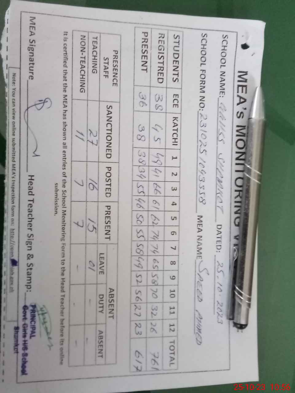 | Certified that this School was Inspected by the Undersigned MEA/DMO Today and the Information Stated Above is as Per Record. | |||||