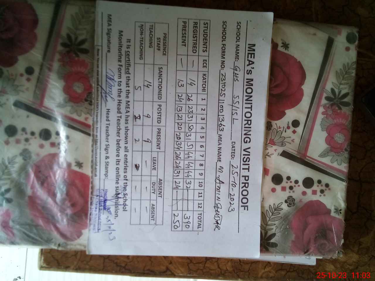 | Attendance Register | Head Teacher | MEA with School | Visit Proof |