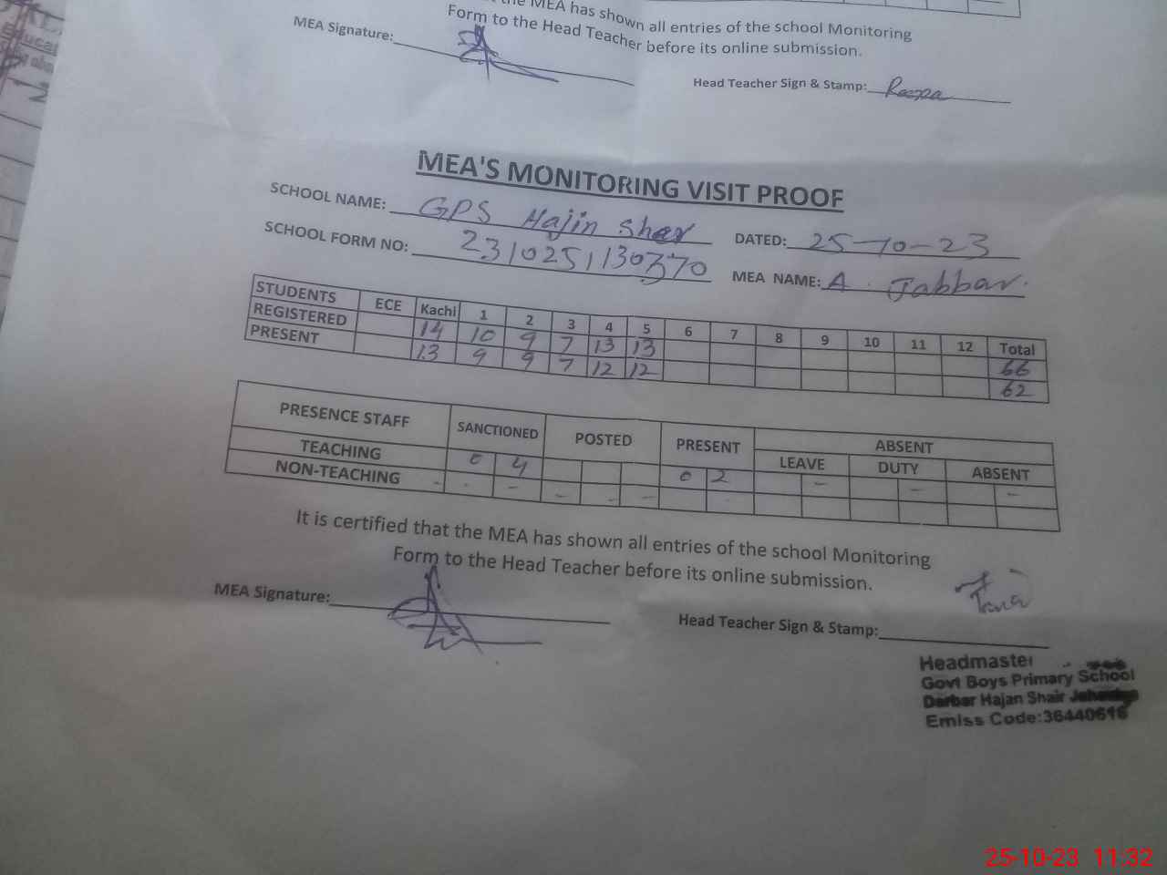 | Certified that this School was Inspected by the Undersigned MEA/DMO Today and the Information Stated Above is as Per Record. | |||||