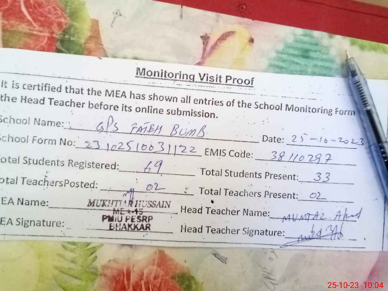 | EMIS Code: 38110297 | Name of School: GPS FATEH BUMB | |||