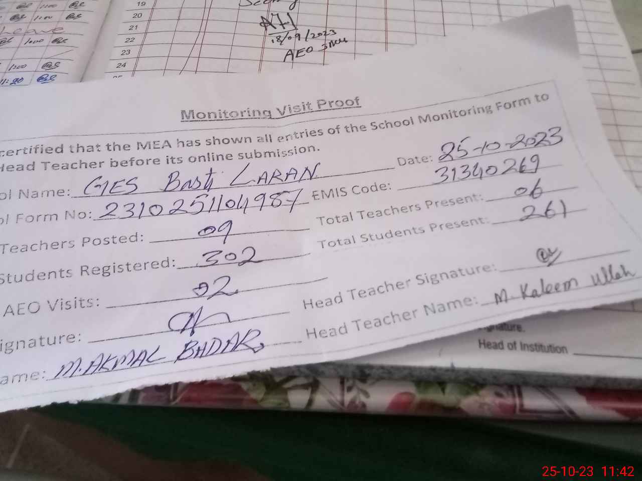 | Attendance Register | Head Teacher | MEA with School | Visit Proof |