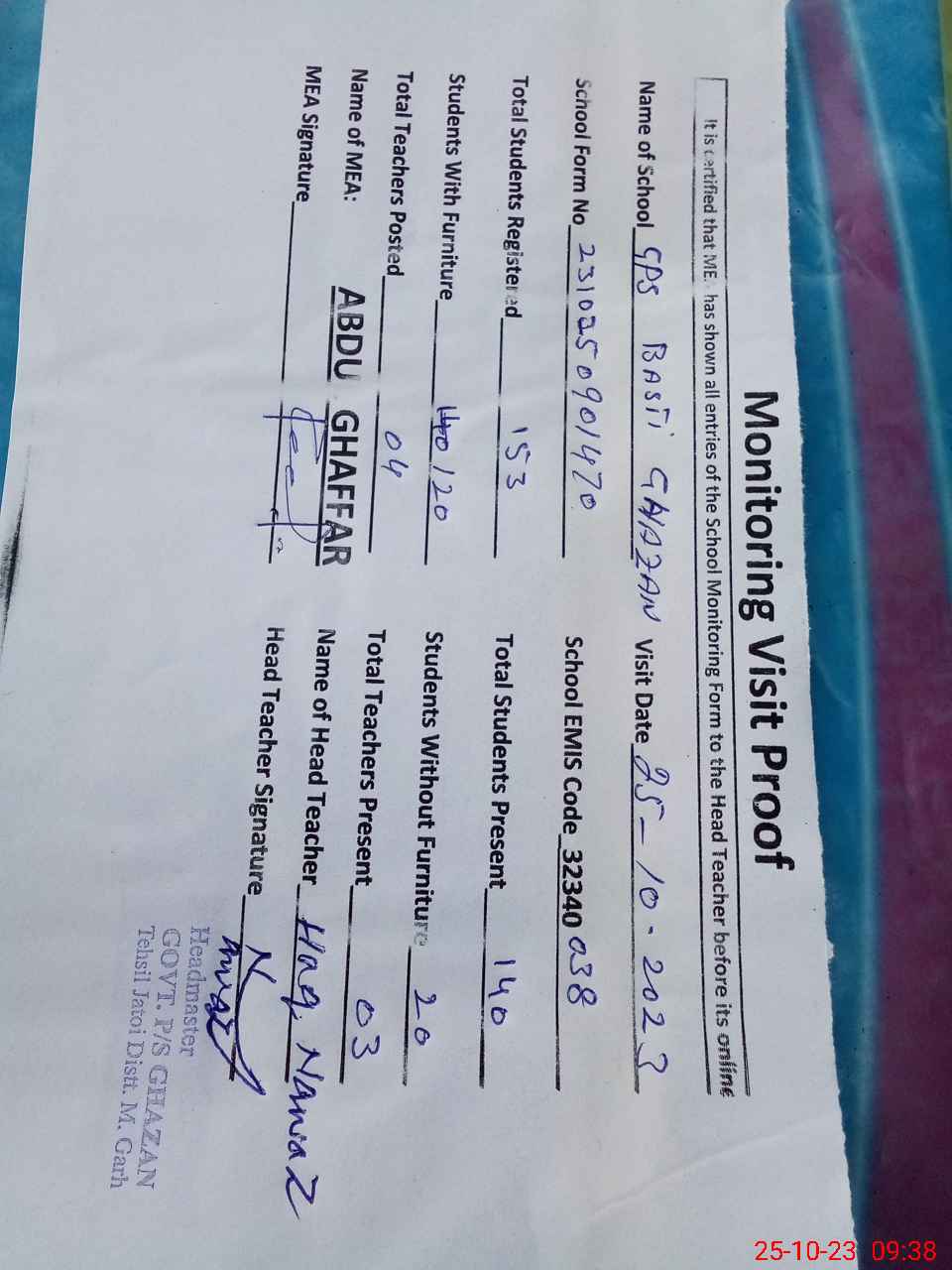 | EMIS Code: 32340038 | Name of School: GPS BASTI GHAZAN | |||