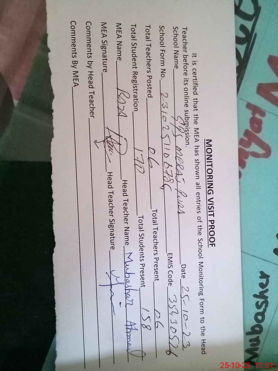 | Attendance Register | Head Teacher | MEA with School | Visit Proof |